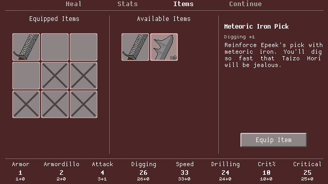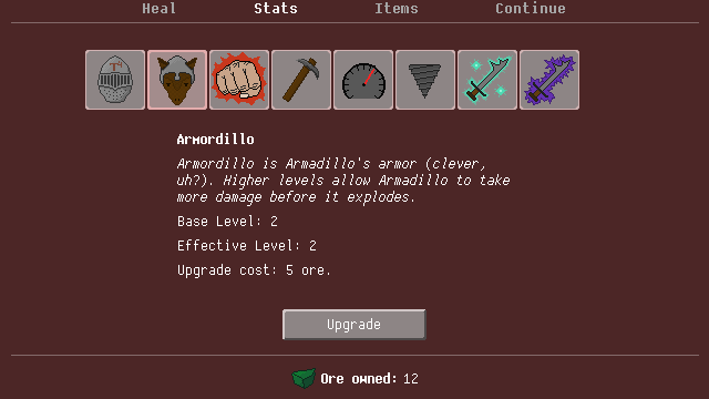 I implemented a new upgrades system, including the latest iteration of the Stats design (not to mention a much cleaner implementation, which shall make it easier to add new items to the game).